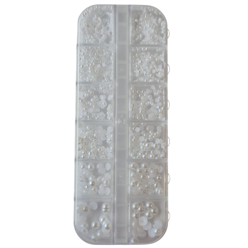 Valged poolpärlid karbis erinevate suurustega